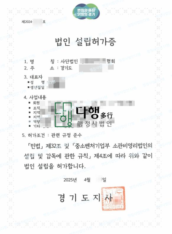 [25년4월]사단법인설립/경기도지사/중소벤처기업부소관규칙 페이지 정보 작성자 관리자 작성일26-03-11 14:44 조회14회 관련링크 본문 25년 4월 행정사법인다행의 대행으로 『민법』 제 32조 및 『중소기업부 소관 비영리법인의 설립 및 감독에 관한 규칙』제 4조에 따른 사단법인이 설립되었습니다. 이전글 다음글 목록